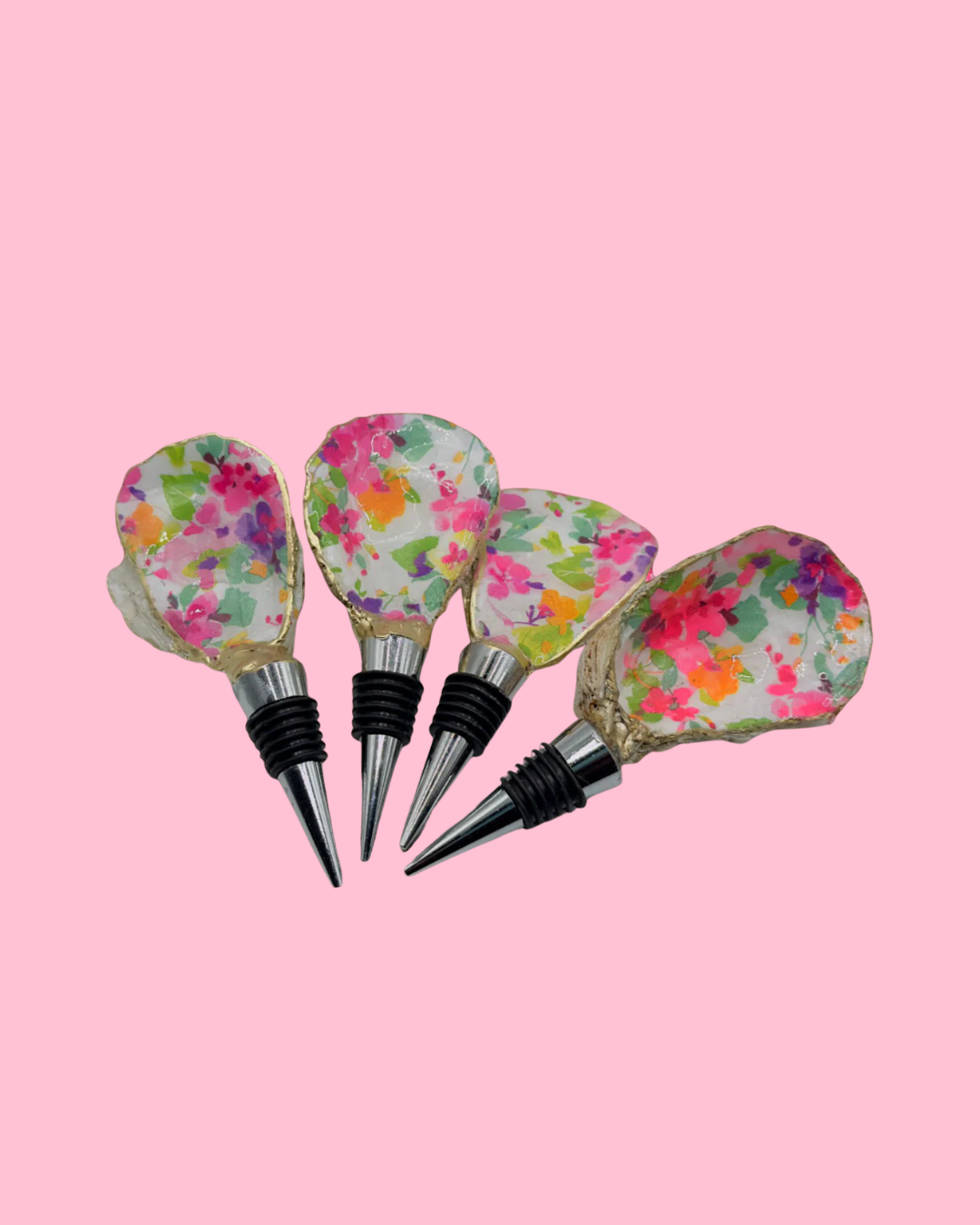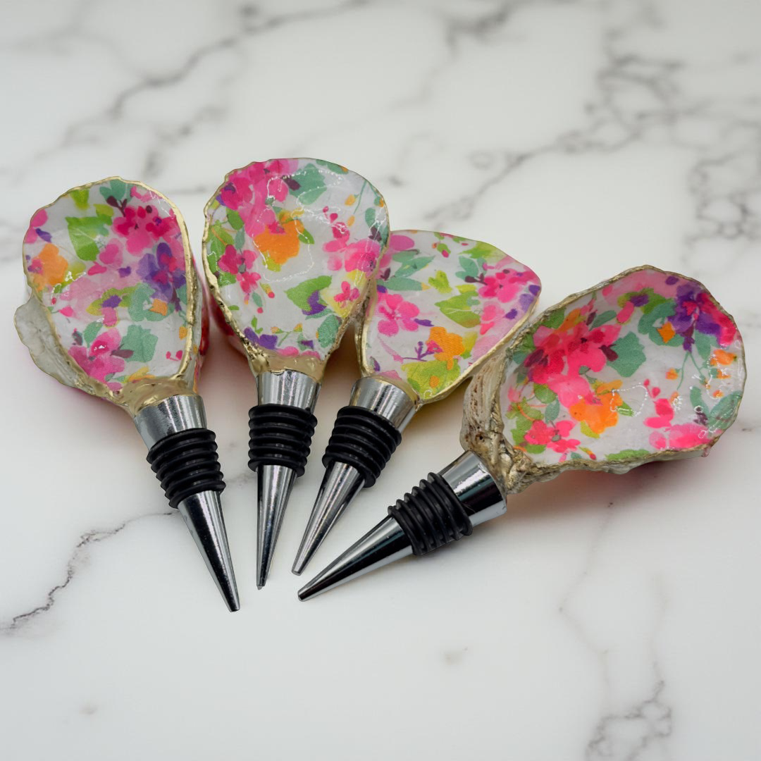 Pop the cork and let spring bloom with our Bloom Burst Oyster Shell Wine Stopper. Each piece starts as a locally foraged Connecticut oyster shell, hand-leveled and decoupaged in an exuberant confetti of hot-pink, tangerine, lilac, and lime blossoms. A glass-clear epoxy resin seals the art for lasting shine, while the rim is hand-gilded in luminous metallic gold. Beneath, a food-grade stainless-steel base with leak-proof silicone rings fits most wine, olive-oil, or vinegar bottles—keeping every pour crisp while adding garden-party joy to bar carts, brunch tables, and patio soirées.