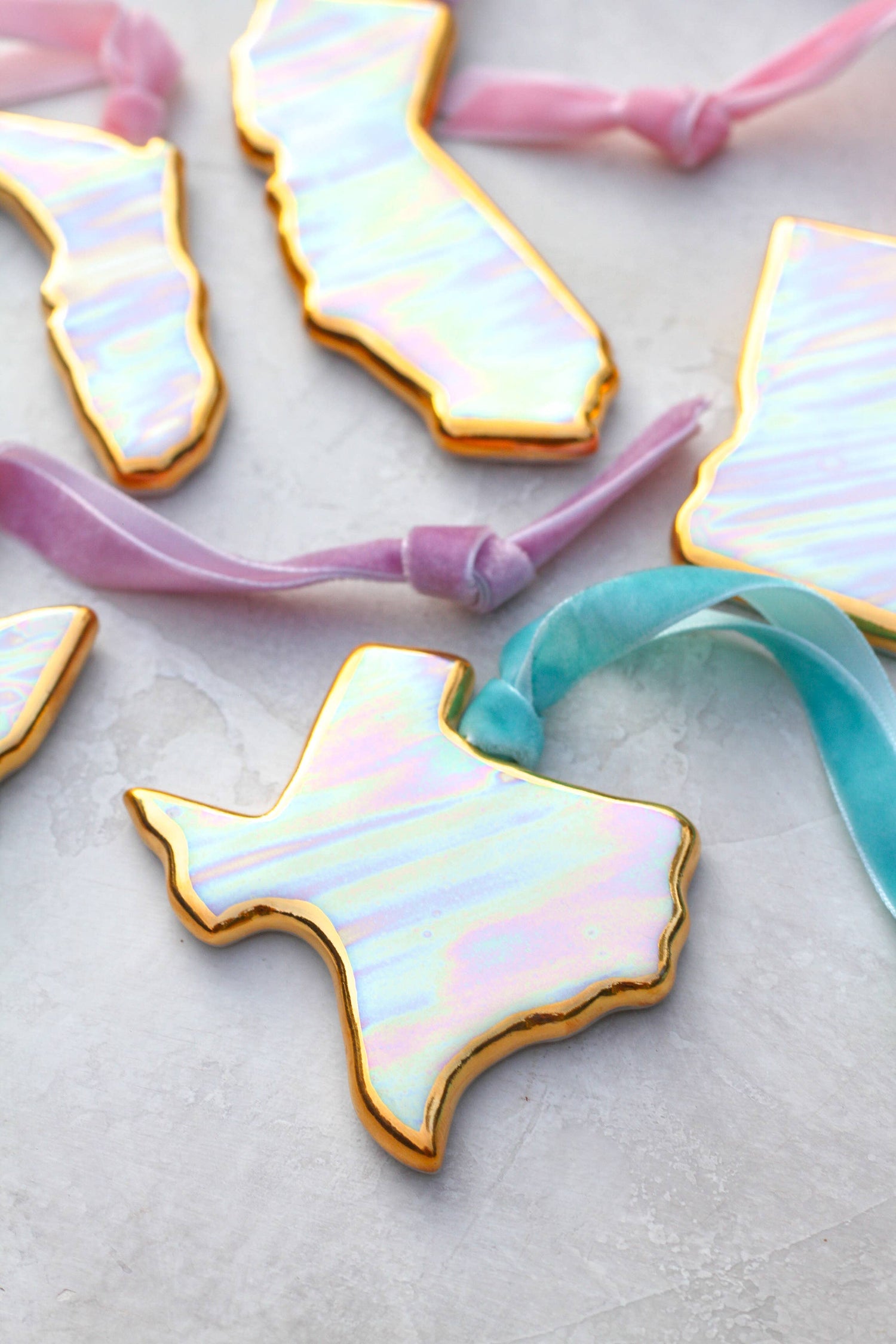 Celebrate your state pride with these beautiful porcelain ornaments, each handmade in the shape of a beloved U.S. state. Featuring an iridescent luster and outlined in luxurious 22k gold luster, these ornaments capture the elegance and charm of the season, making them perfect for holiday decorating or year-round display.