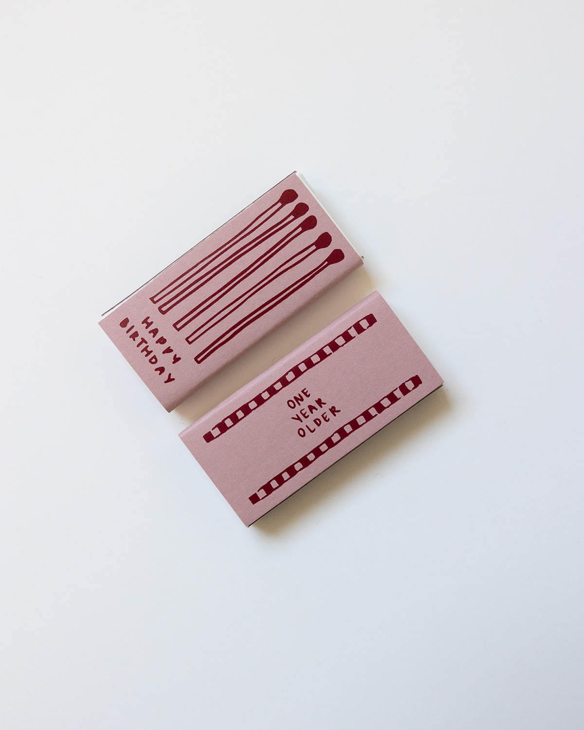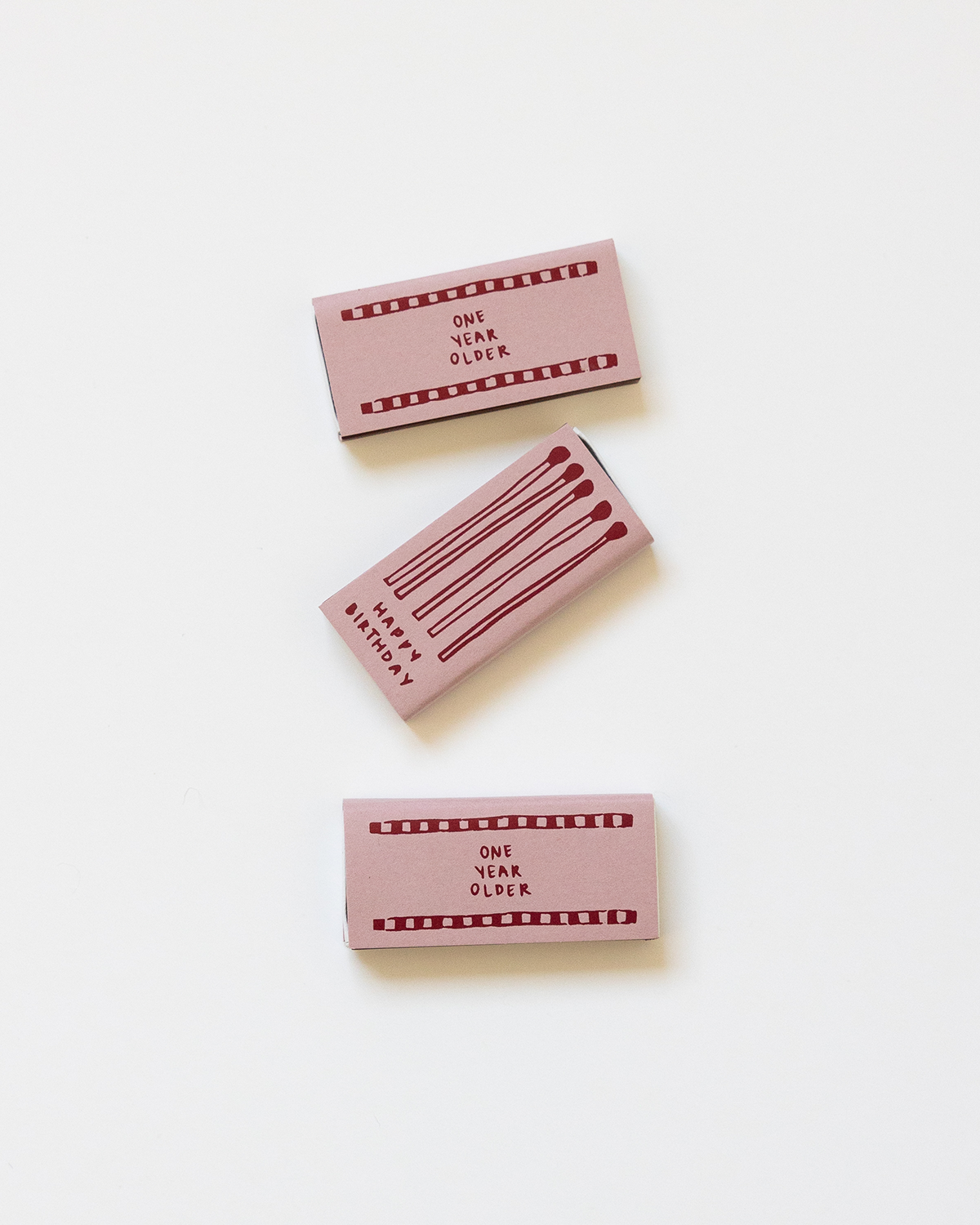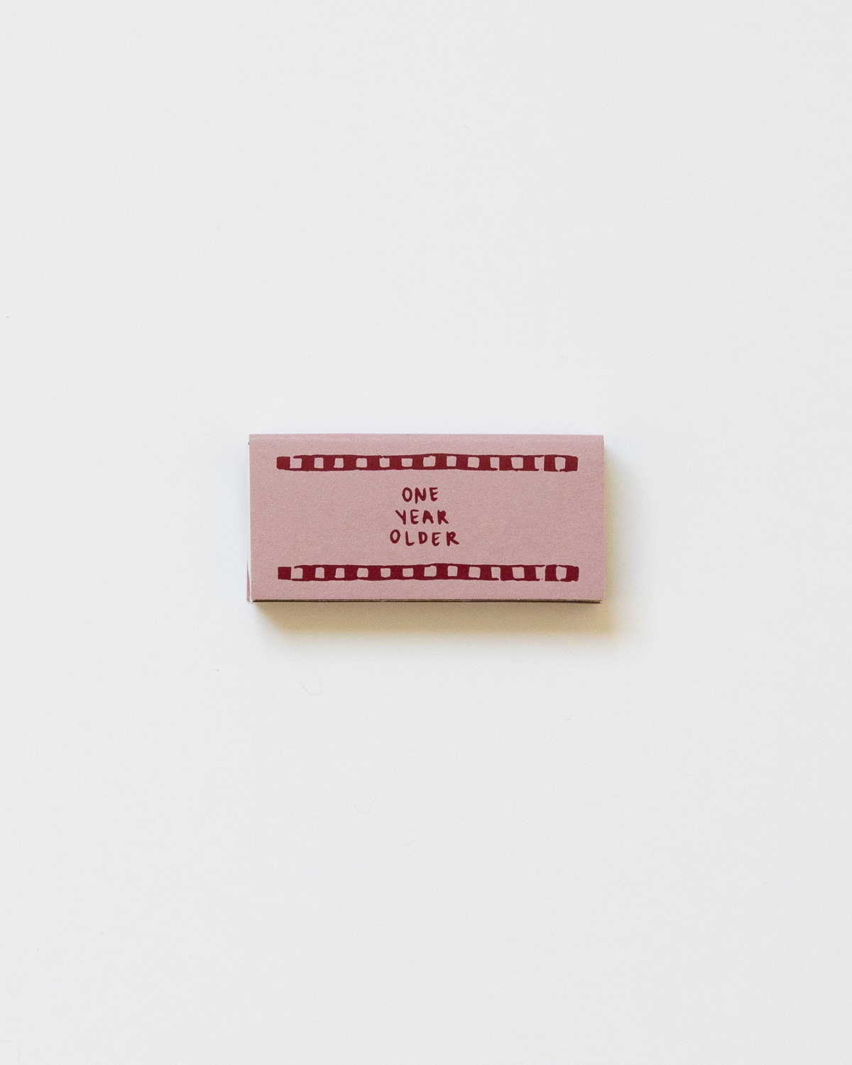 Our matchbox features a charming design that says "One Year Older" in a playful font with checkered lines, accompanied by birthday candles on the back. It's a fun touch that adds to any birthday gift.