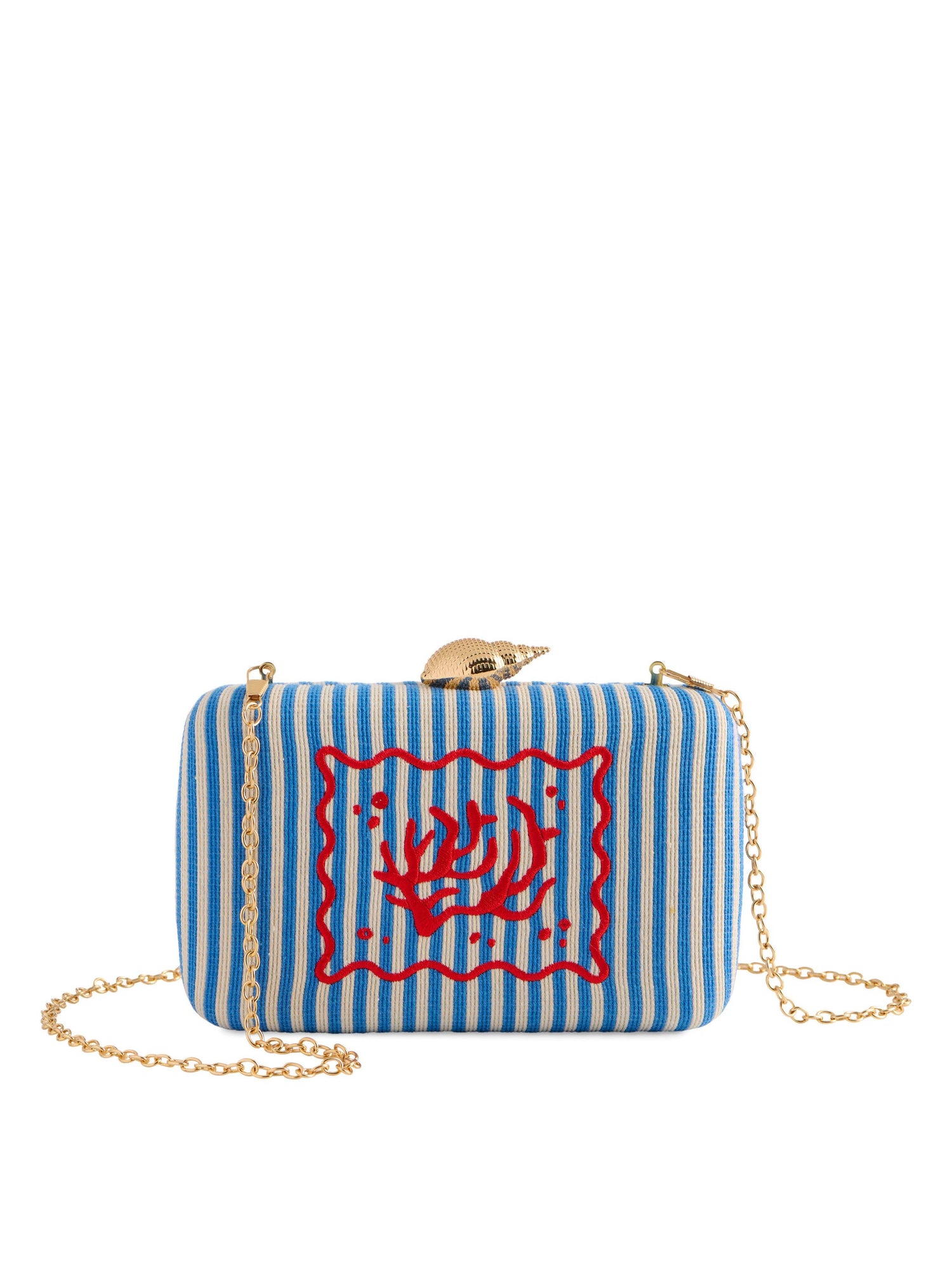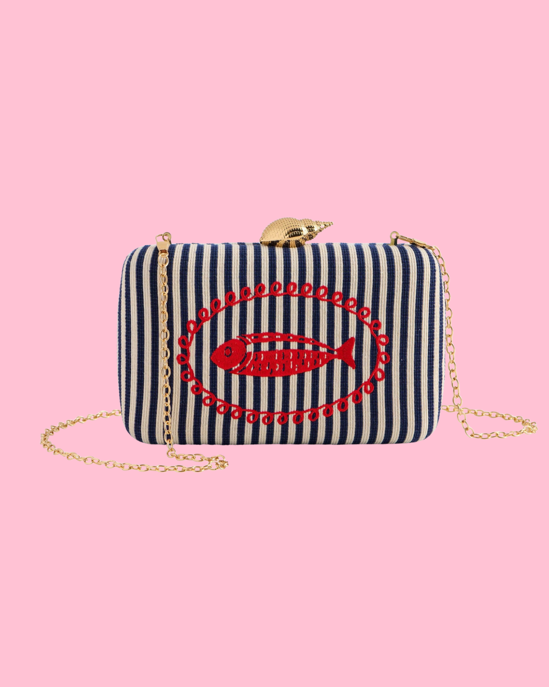 L 7.5" x W 1.75" x H 4.75"; chain 23"; polyester; gold hardware; detachable cross-body chain; magnetic frame closure