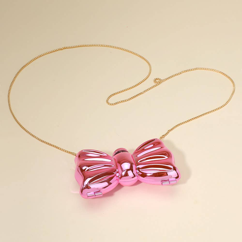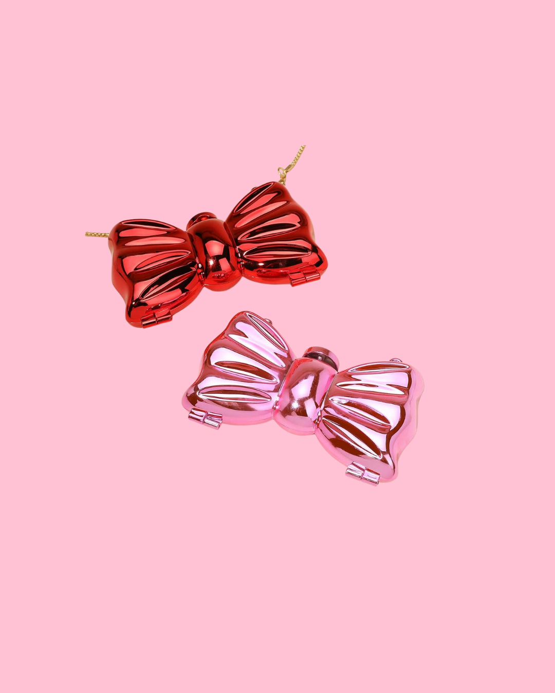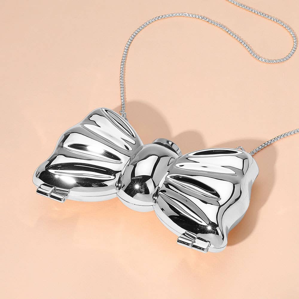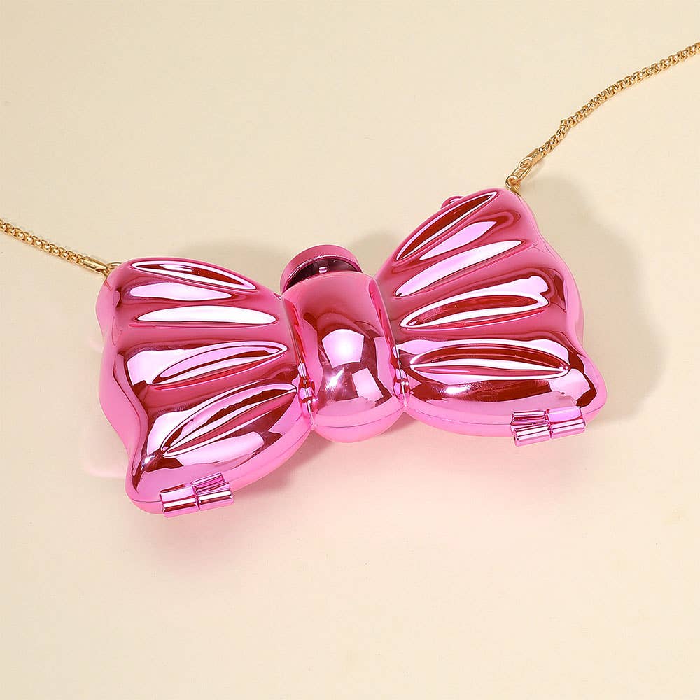 • This bow-shaped clutch doubles as an elegant accessory and a practical beauty essential with built-in mirrors inside. Designed with a glossy hard case finish and chain strap, it’s perfect for parties, weddings, or nights out. The playful bow silhouette stands out while the functional mirrors make touch-ups effortless on the go. A compact yet stylish purse that blends charm, utility, and sophistication in one statement piece.