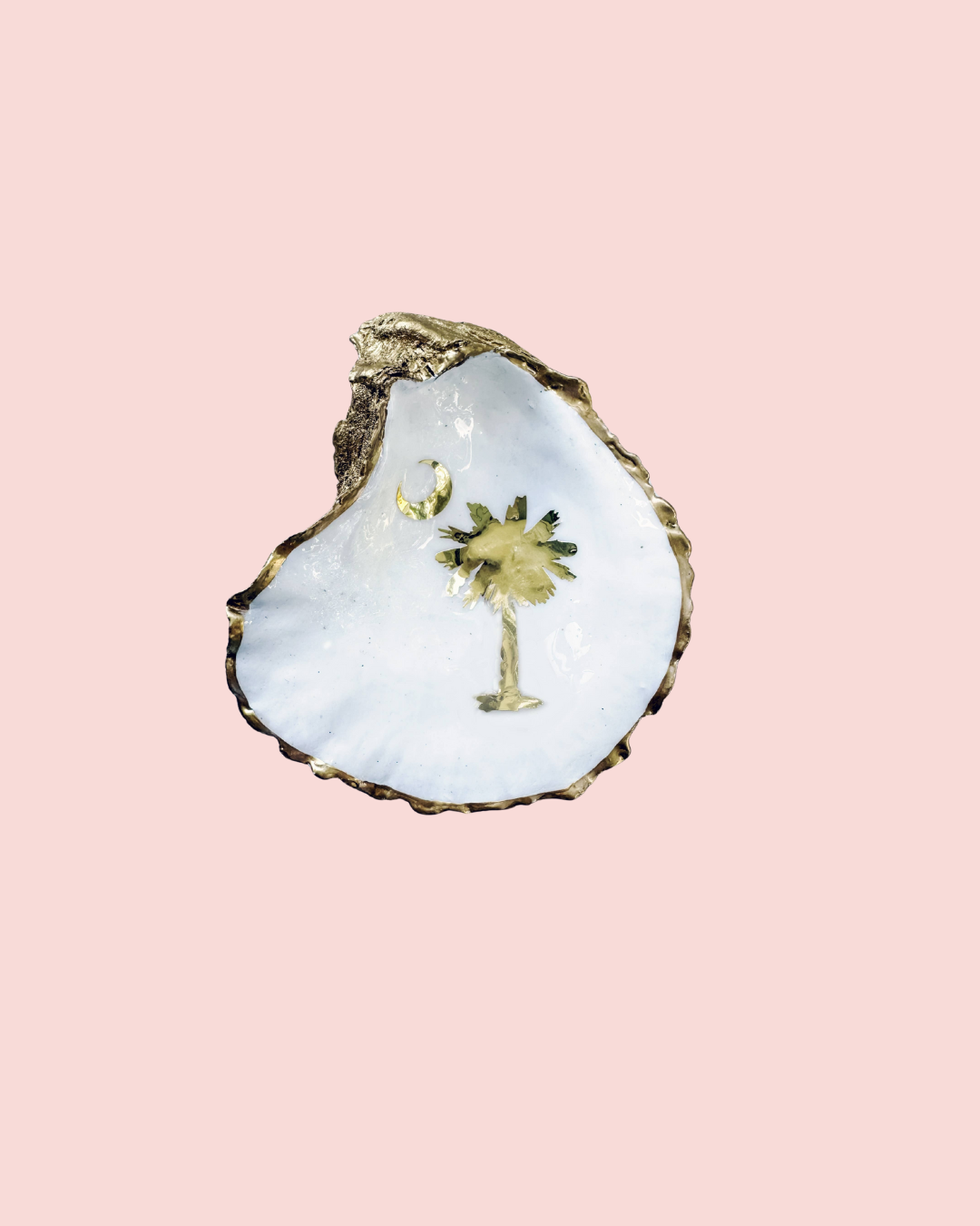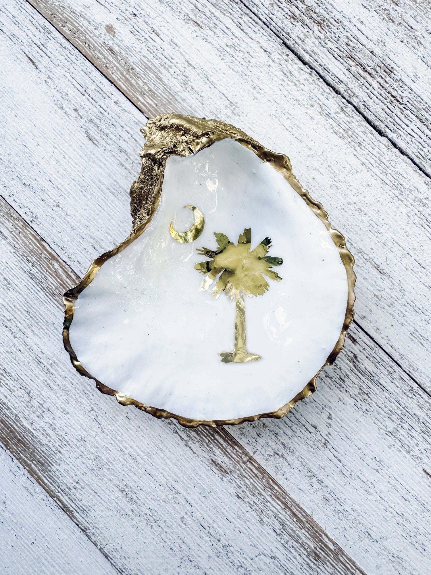This beautiful oyster shell ring dish is gilded in gold leaf paint and features a palmetto tree and crescent moon decal. This would make a perfect gift for a South Carolina native or resident!