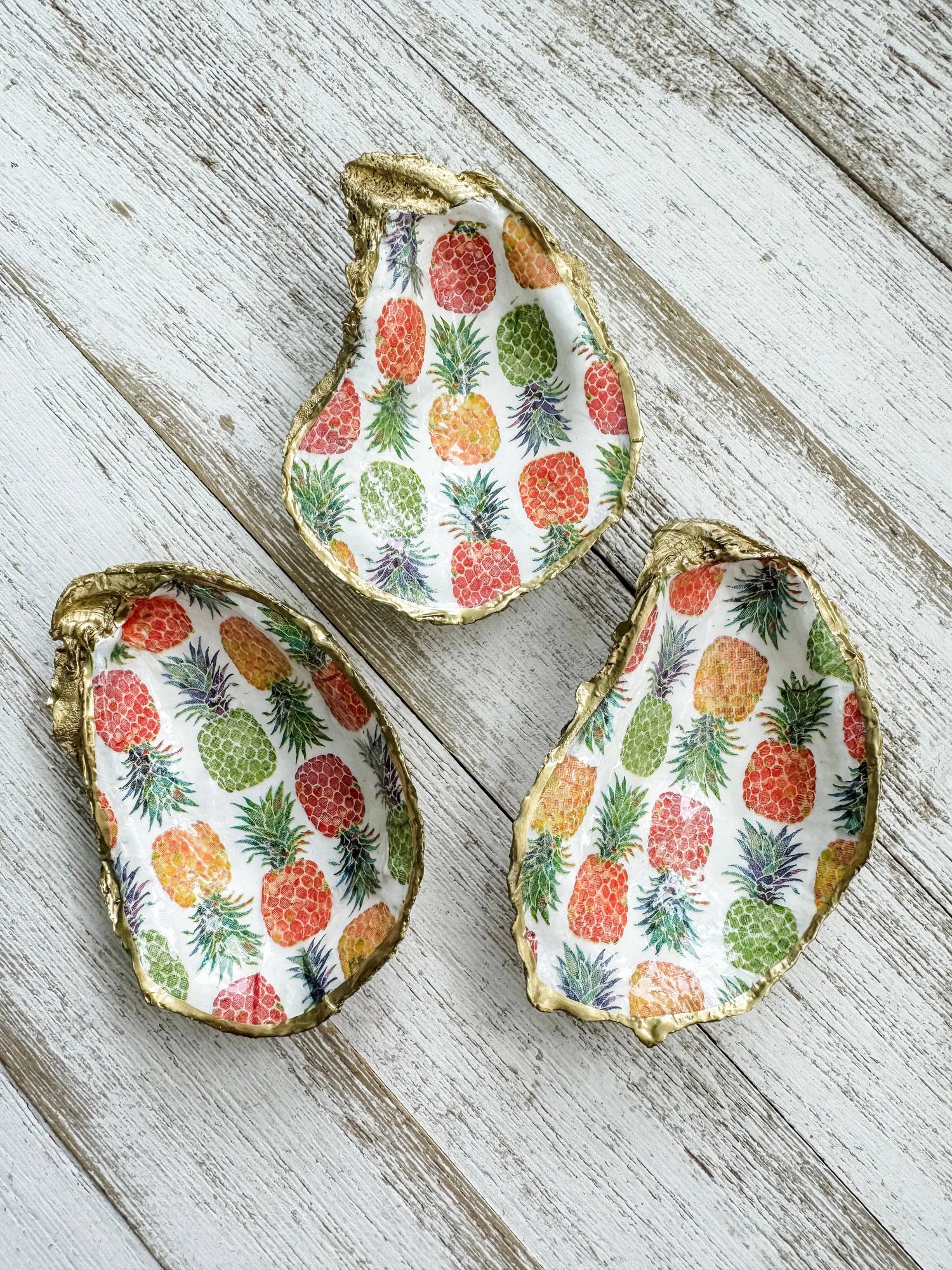 Expertly hand-crafted, this gilded Oyster Shell Ring Dish features a colorful pineapple print and is trimmed in gold leaf paint for a touch of elegance. The perfect way to stylishly store your favorite pieces of jewelry.