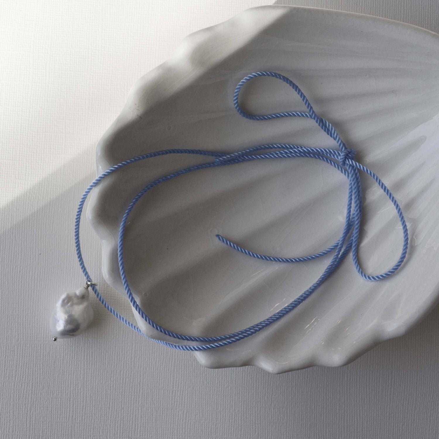 Sky blue rope necklace with baroque pearl dangle. Double up this tie necklace to leave the bow in the front or back.