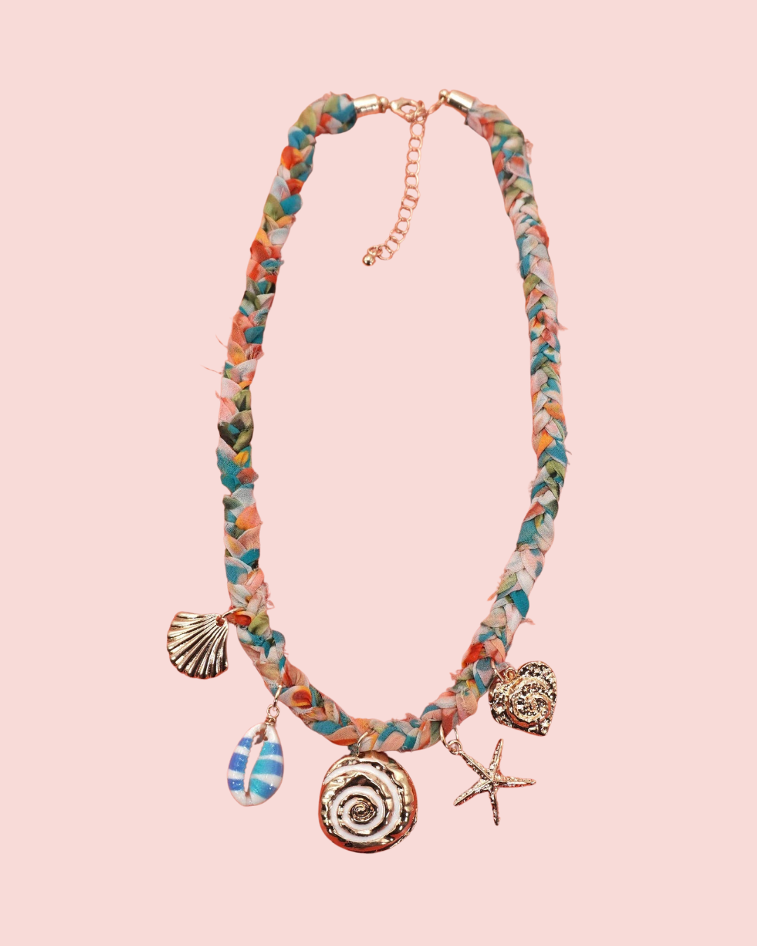 Boho Chic Scarf this Scarf Charm Necklace, featuring a knotted fabric design adorned with unique charms, including a seashell, sun, pearl, and conch. Blending playful coastal vibes with elegant touches, this accessory is perfect for adding interest to any outfit. Wear it as a statement necklace or style it as a scarf accent for a fresh, layered look.