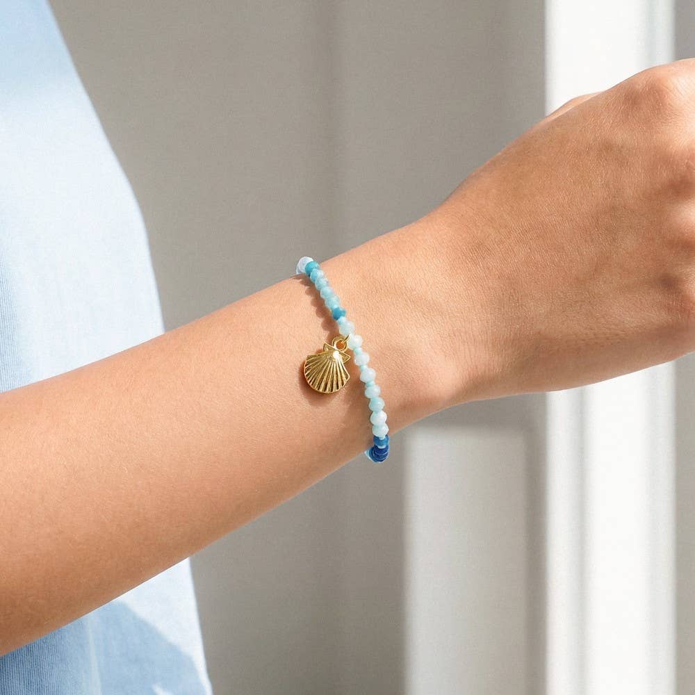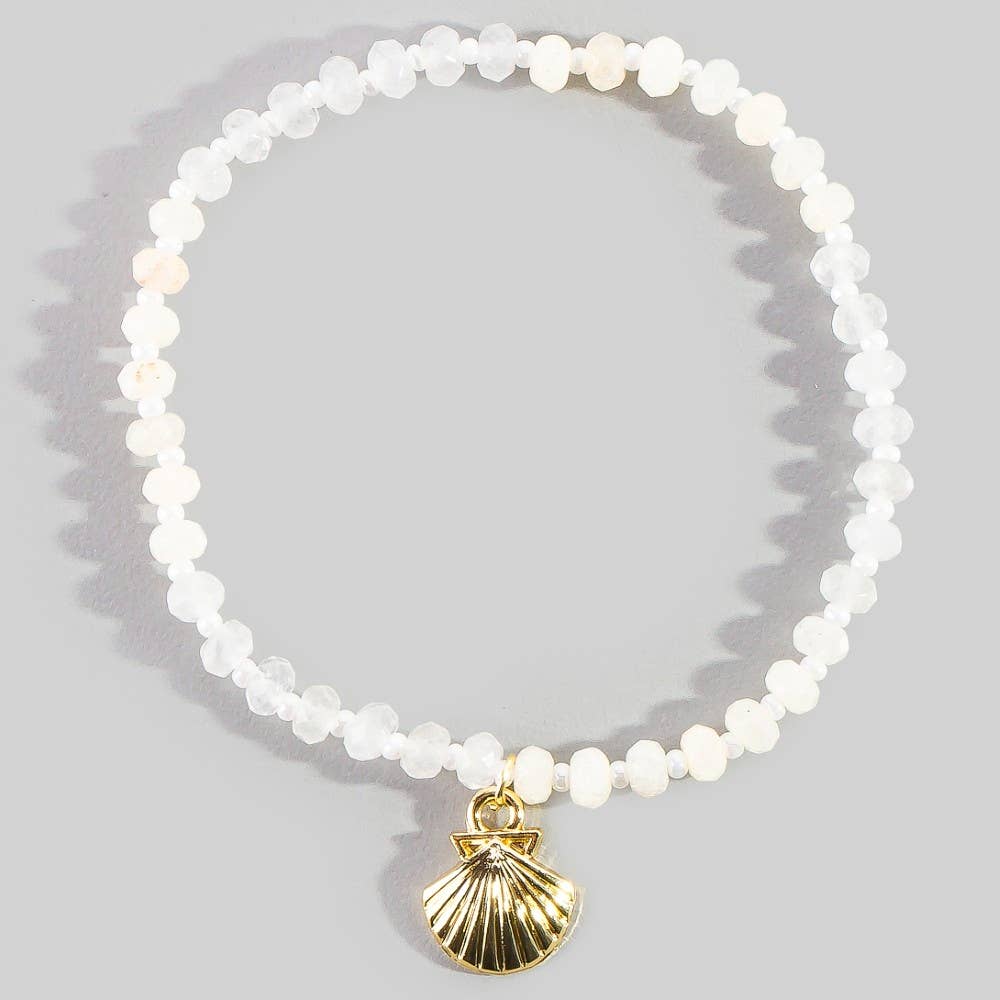 This bracelet displays a fashionable seashell charm beaded style. Indulge in the artistry of accessorizing with this unique piece.