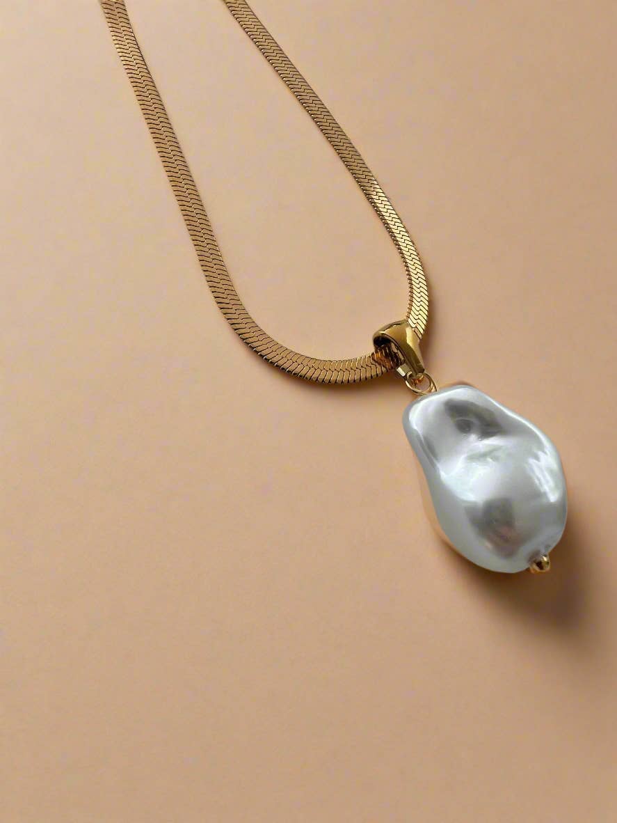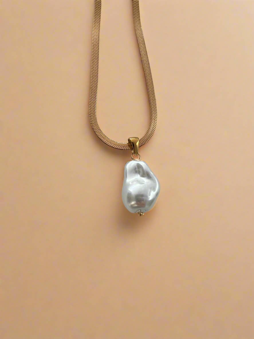 18k gold plated flat snake chain with faux pearl drop pendant.