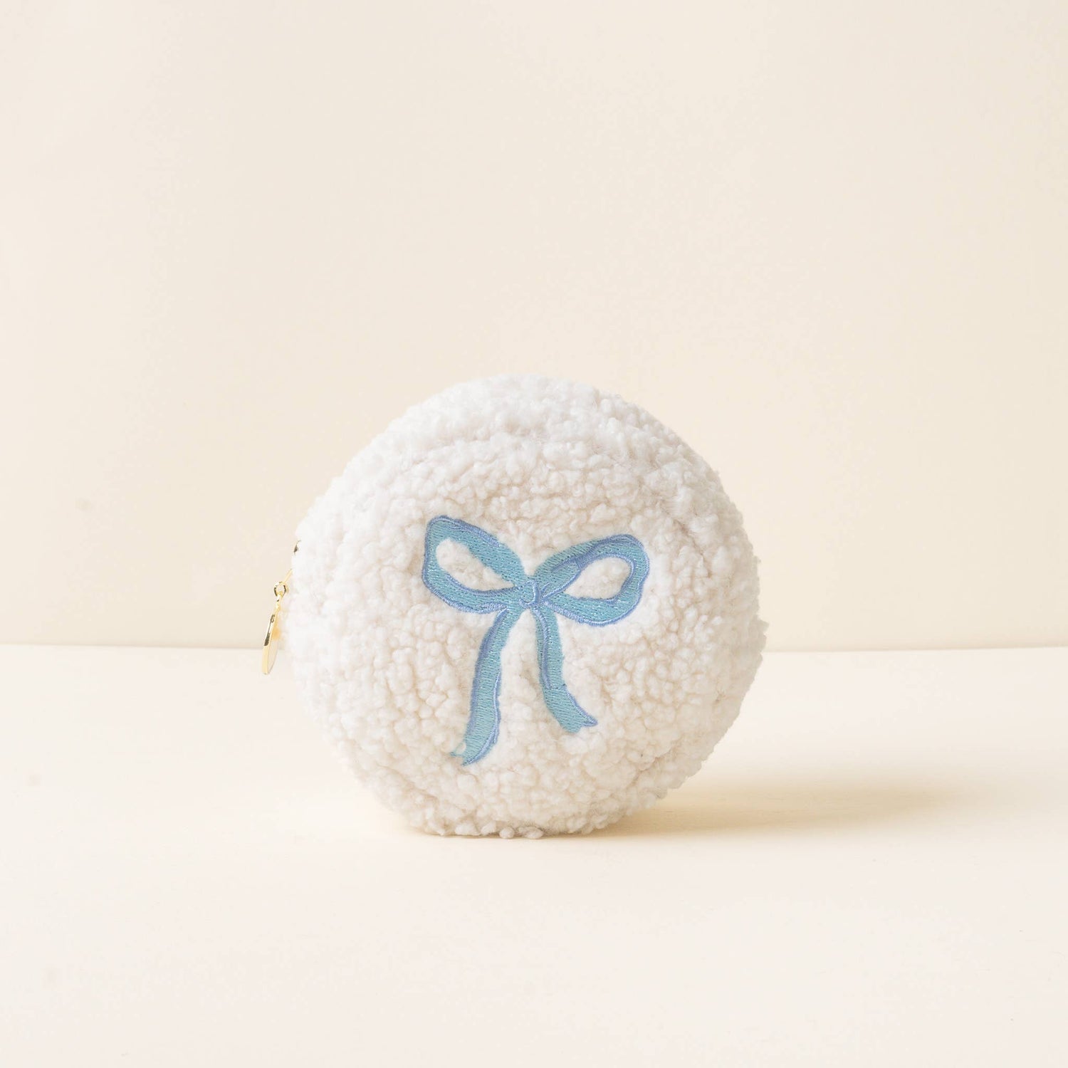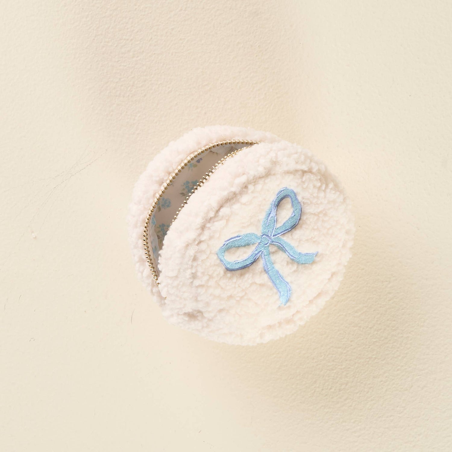 Keep your essentials stylish and organized with our circle teddy pouch. Crafted from soft sherpa fabric, this compact pouch features a wipeable lining for easy cleaning and gold zippers and hardware for a touch of sophistication. The interior is lined with a playful printed fabric. Perfect for holding smaller items like lipstick or chapstick, this pouch also pairs beautifully with our rectangle or square options.