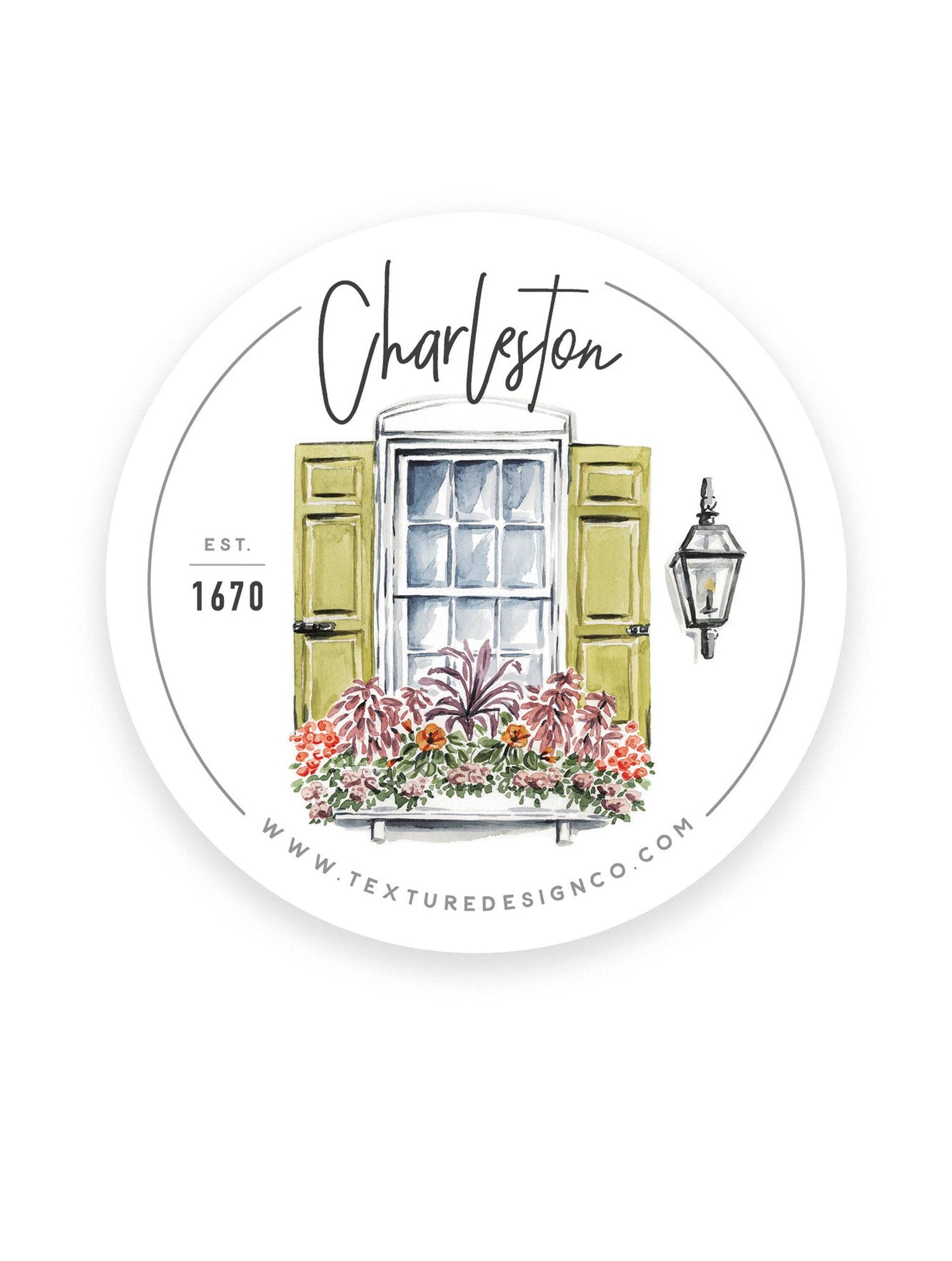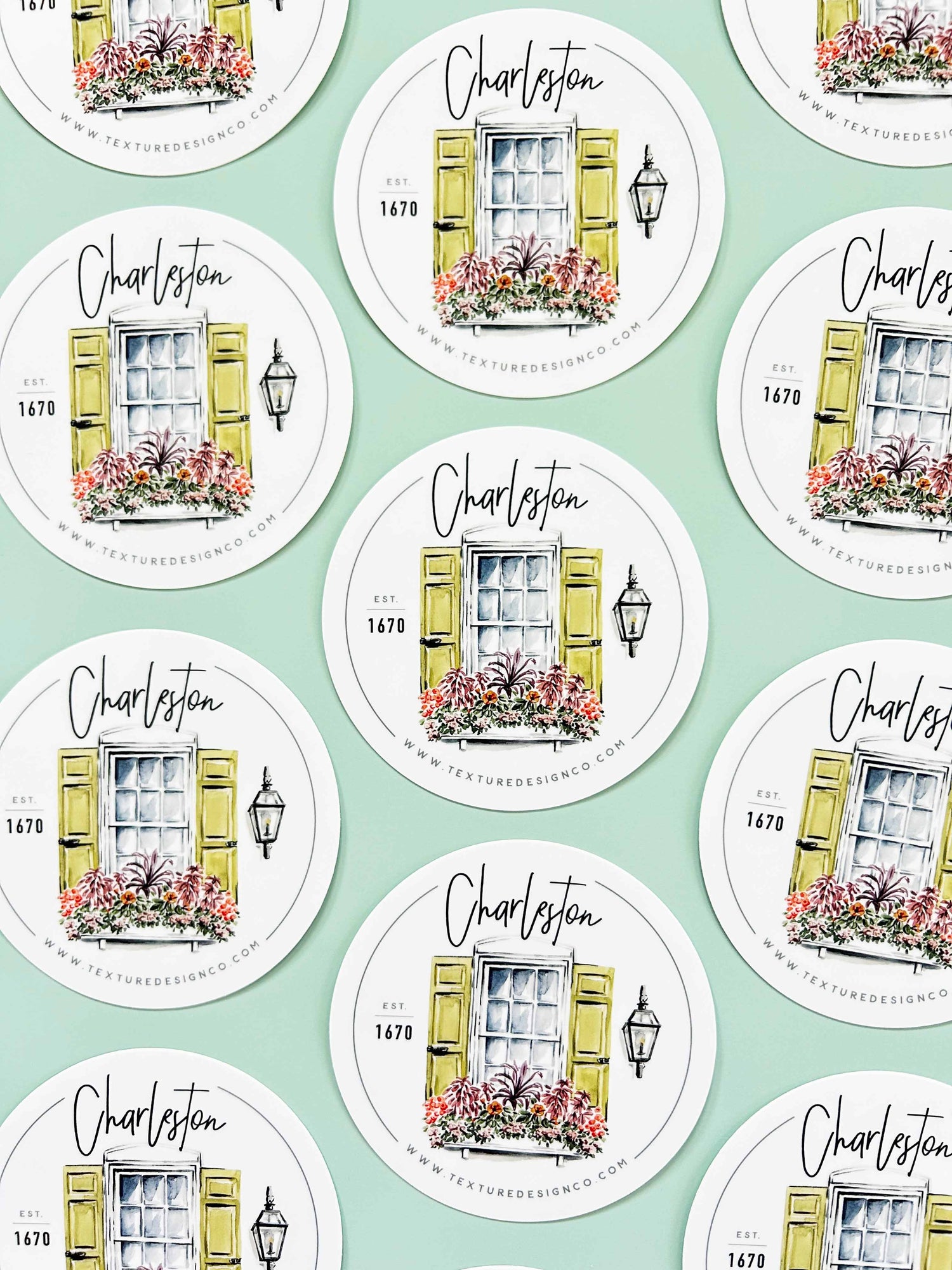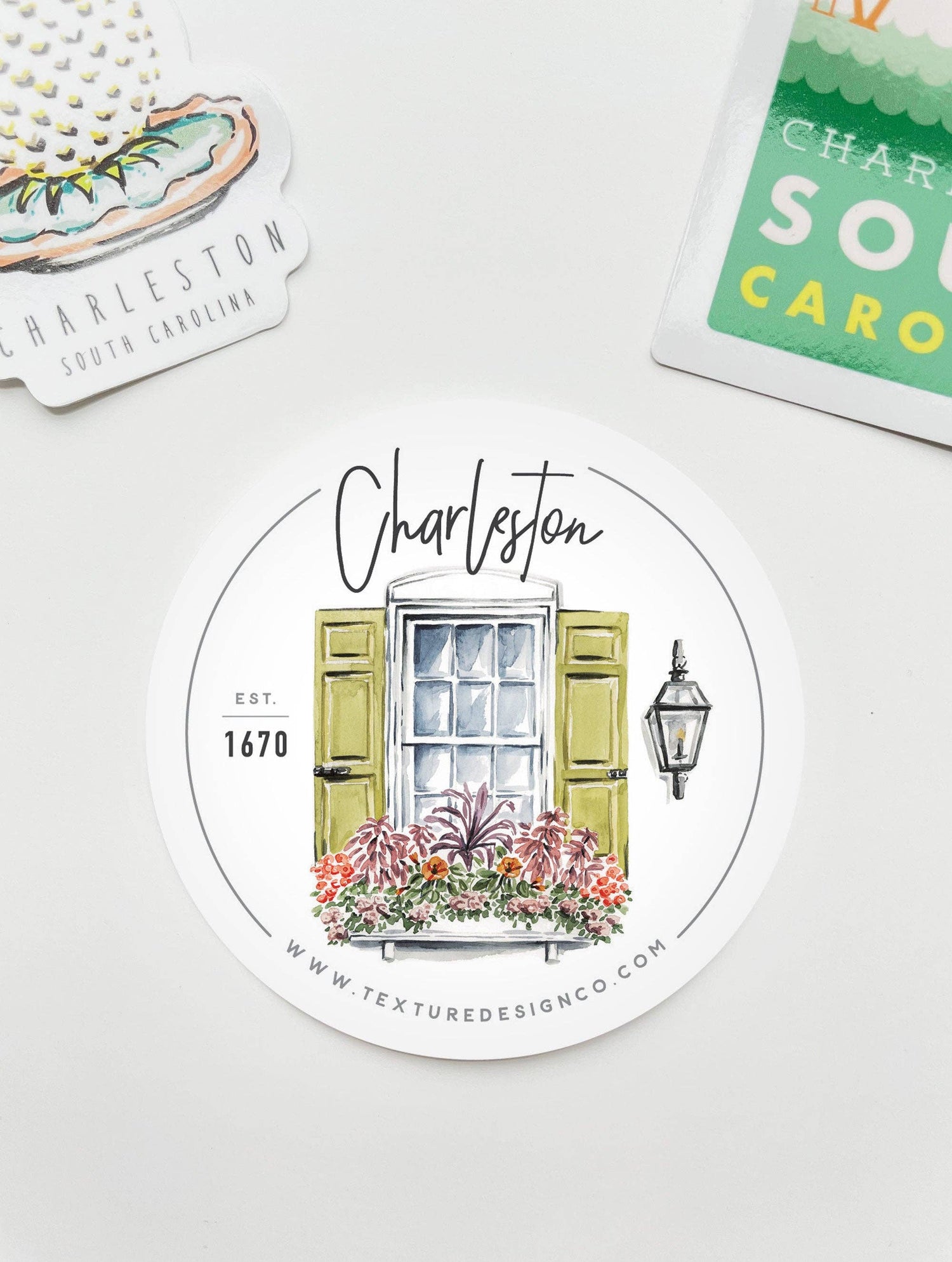 The circular Charleston Flower Box sticker showcases a classic Charleston flower box, bursting with colorful blooms and Southern charm. The heavy duty sticker is perfect for decorating laptops, water bottles, or notebooks with a touch of Lowcountry elegance.