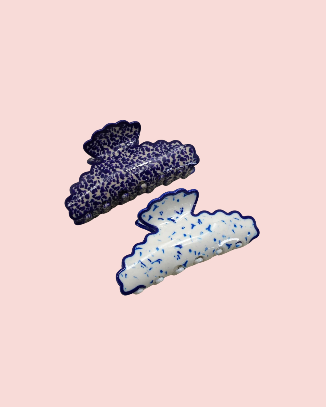 Vintage Porcelain Style Half Moon Hair Claw Clips. Featuring delicate porcelain-inspired toile pattern designs, these clips offer a secure hold while exuding vintage charm.